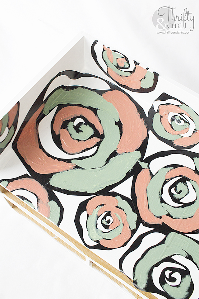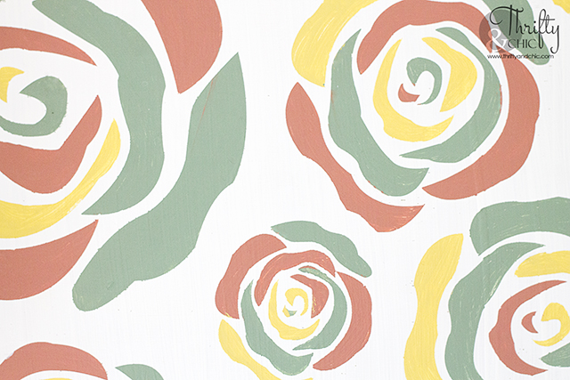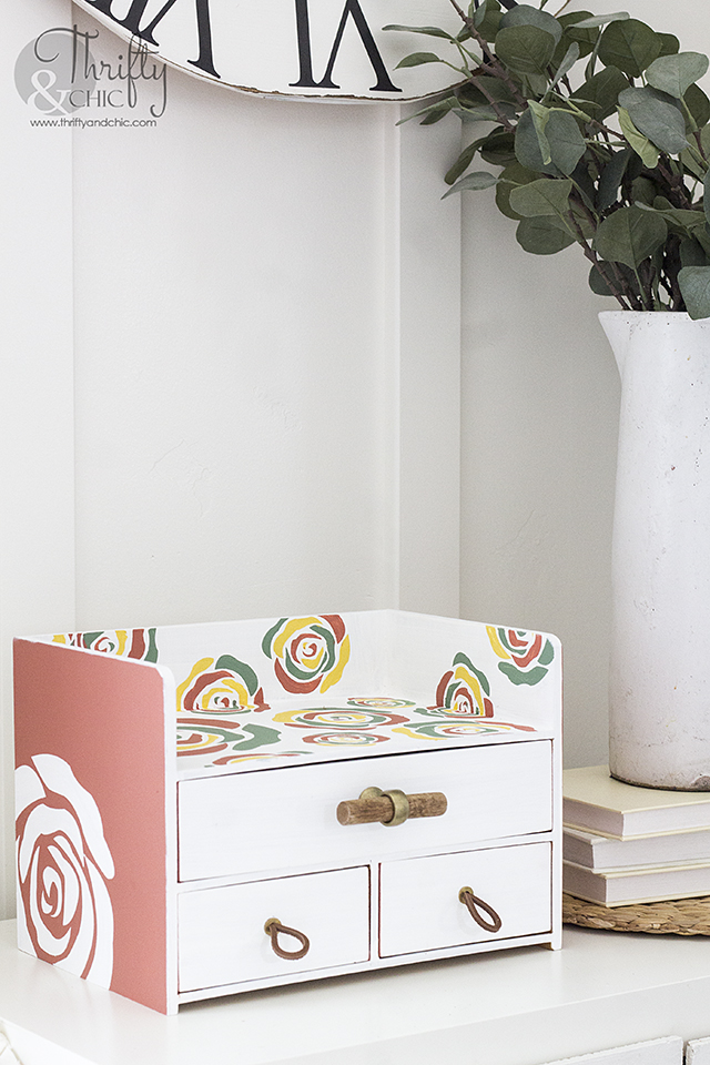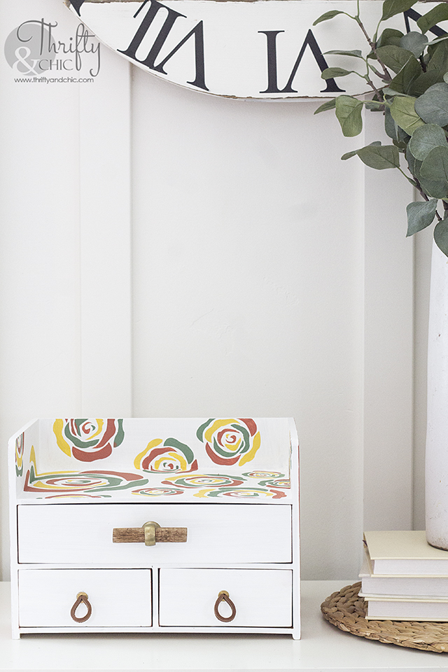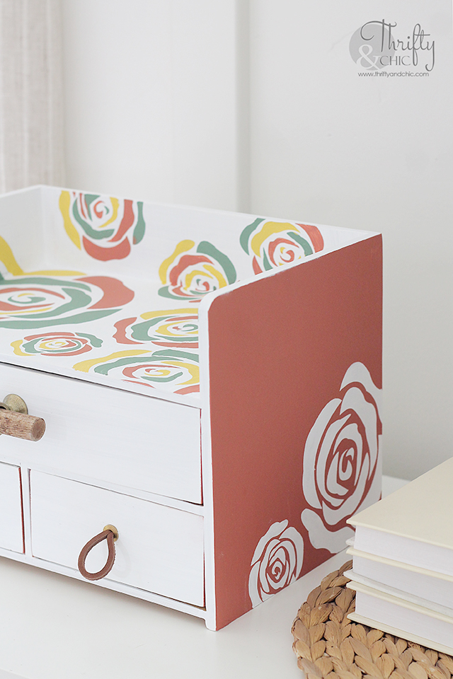 Step 8: Paint the sides of the organizer with Dried Clay. I then added another rose in White Wash. You can either do this beforehand by placing the petals down first, and then painting over it with the Dried Clay. Or add the stencil of the rose afterwards, and painting the White Wash over the Dried Clay.