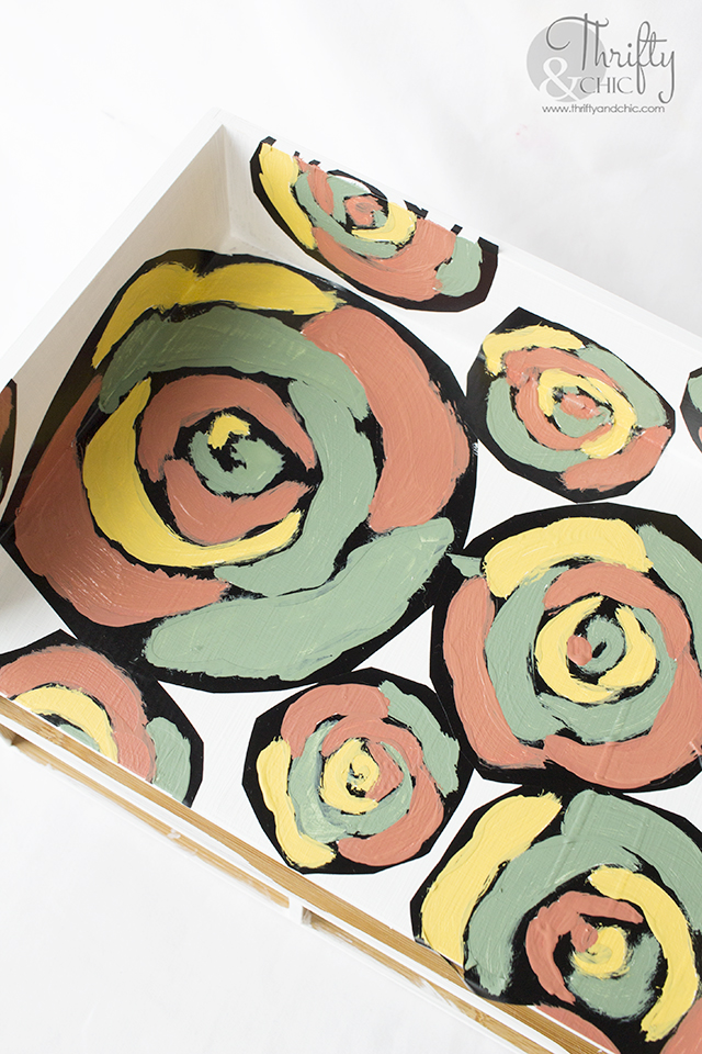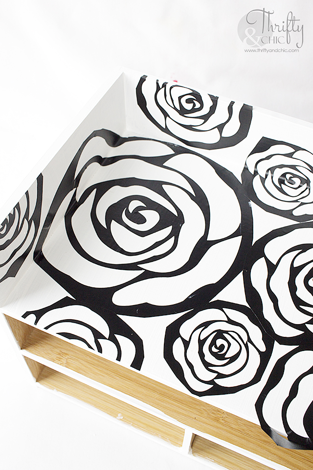 Step 3: Using vinyl cut outs, place your design on the top shelf of the organizer. I used this rose motif in multiple sizes. To get it in the corners, bend the design and place it in the corner first, and then continue to press down the design from there. My largest rose is about 7" in diameter. The smallest one is about 3".