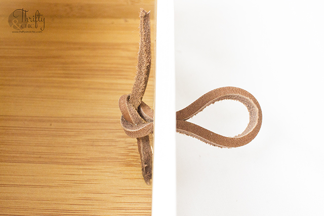 Step 11: On the bottom two drawers, I added my own little handle by using 8" leather strips. I pulled the strips through a washer, and then through the hole. I tied the leather into a knot on the backside of the drawer.