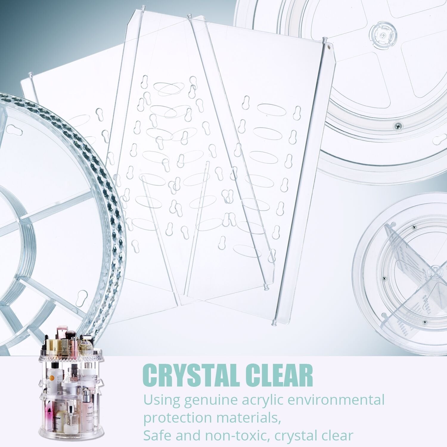 >Makeup Organizer Shelf is made of high quality acrylic material, strong and durable, with transparent and glossy surface, and its edge is crystal structure, which looks very upscale.